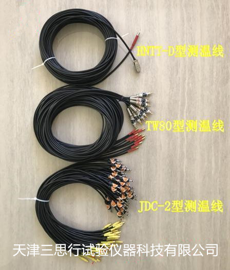 预埋式测温线由插头、导线和温度传感器制成,适宜测量混凝土内部温度,每支测温线可测一点温度,在施工中可任意布置测温点。为便于分层测温,每支测温线的插头都贴有相应长度规格的标签。